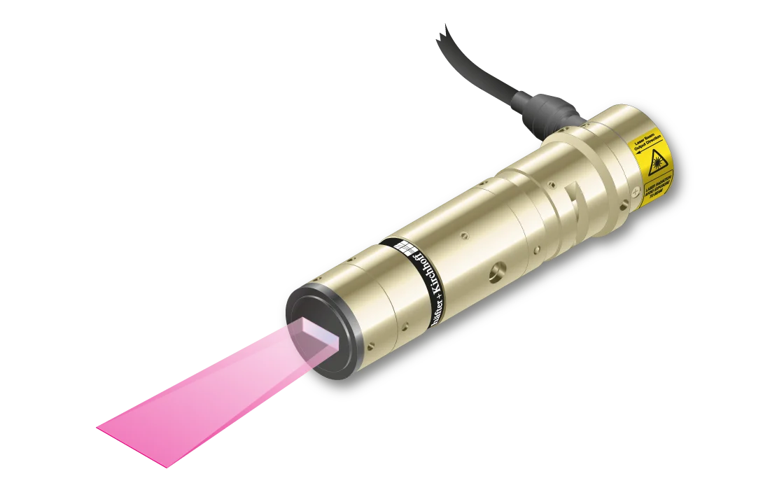 The laser diode beam source type 13LNM40-M100-7+90CR-660-15-M26-M60-C-6 has a fan angle of 10°, approx. uniform intensity distribution along the laser line and extended depth of focus.