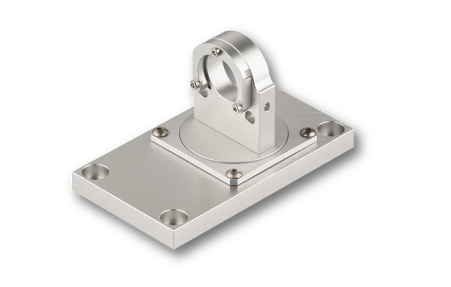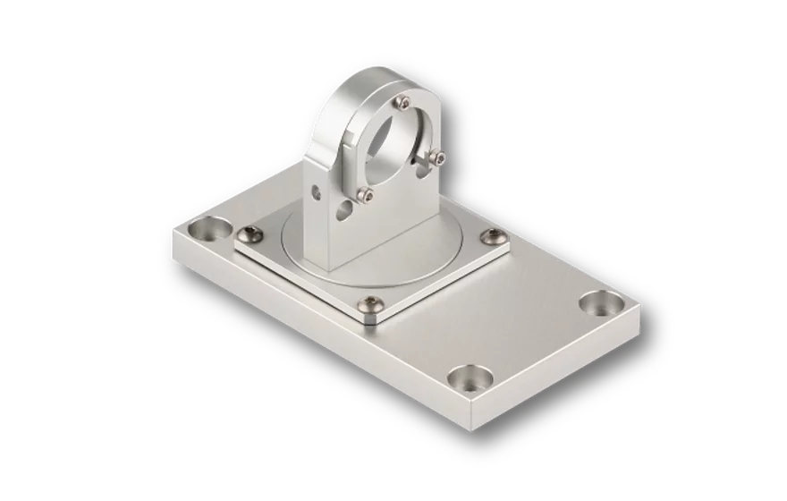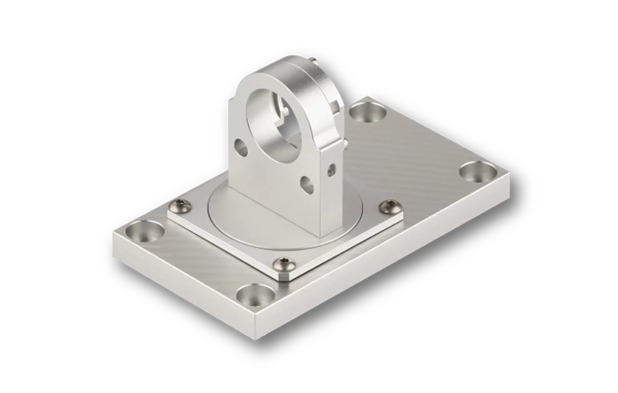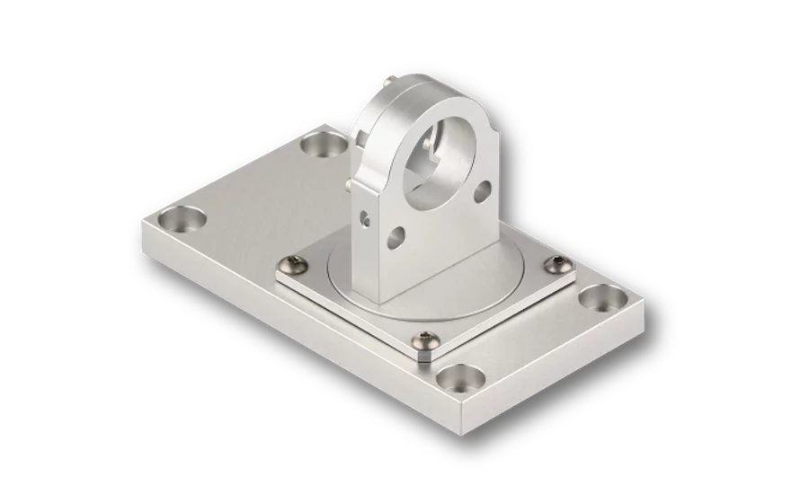 The Mounting Console of type 13MK-25-36-10-M6 with flat base plate allows a precise and mechanically rugged alignment of Laser Modules with Ø 25/28 mm. The lasers are held by means of a clamp collar in such a way that the focussing and focus locking mechanism remain accessible.The Mounting Console is designed for lasers line generators with fan angle (e.g. series 13LR or 13LN, 5LM or 5LP (5LM, 5LP with Ø 25/28 mm only)) and provides 2 degrees of freedom:
