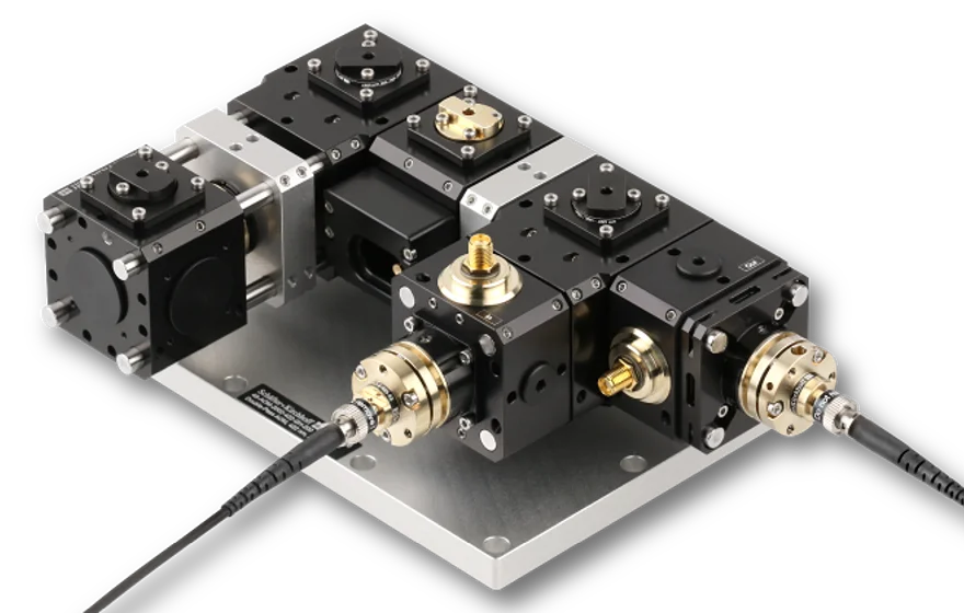 The acousto-optic modulators form the centerpiece of all Integrated AOM Systems. As modulators we integrate purchased AOMs (e.g. MT-Series from AA Optoelectronics, AOMO-Series from Gooch & Housego as well as corresponding modulators from other manufacturers with a similar form factor). The achievable tunability of the output laser frequency as well as the efficiency of the system is determined by the diffraction efficiency of the AOM.