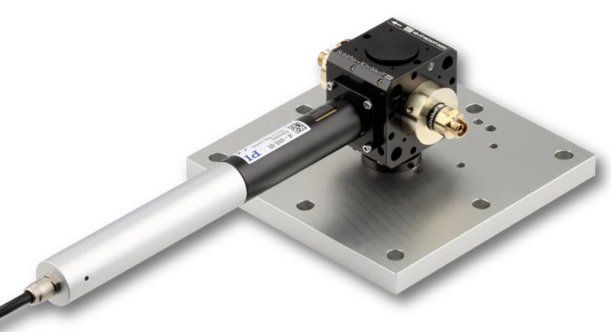 The micrometer screw has a servo motor. A programmable controler with USB and RS232 interface is available.