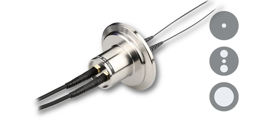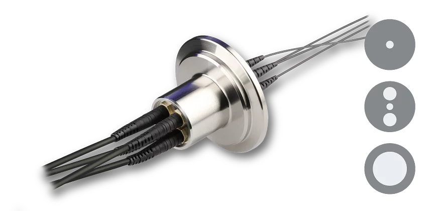 Vacuum feed-throughs and casing feed-throughs by series with one or multiple single-mode, polarization-maintaining or multi-mode fiber cable.