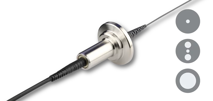 Vacuum feed-throughs and casing feed-throughs with one single-mode, polarization-maintaining or multi-mode fiber cable sorted by flange type.