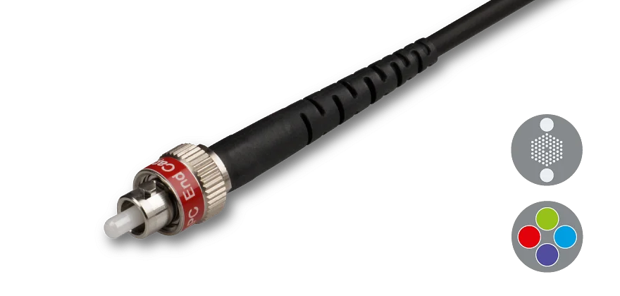 Endlessly single-mode, photonic crystal fiber cables series PCF-S with Gaussian intensity profile and low-stress fiber connectors with end caps.