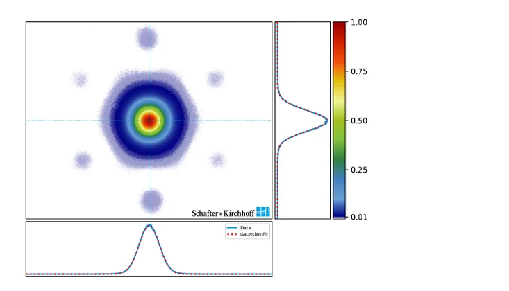 Photonic crystal fibers have many unique properties due to their special microstructure. Of course, this is also visible in the beam profile (see figures on the right). The central spot (zero-order) is almost perfectly Gaussian. Its overlap integral with a 2D-Gaussian function is above 99 %. The hexagonal structure of the beam profile can therefore be neglected in most cases. The higher orders of the beam profile are strongly suppressed and remain below the 1 % level compared to the zero-order intensity. The approximation of a Gaussian like beam shape is therefore more than sufficient for most applications.