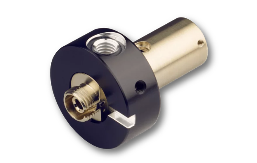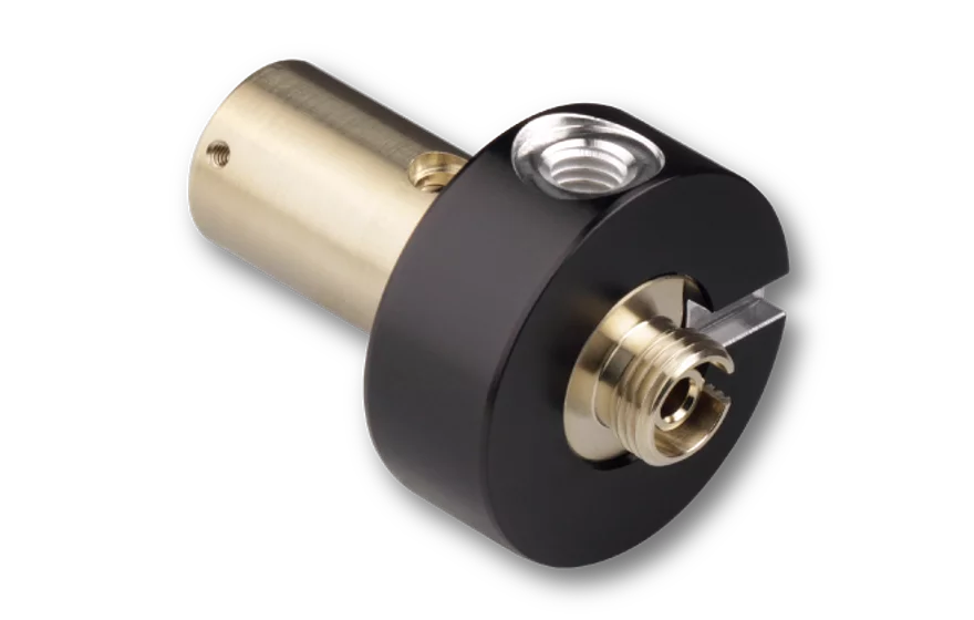 The fiber collimators are mounted using special adapter rings with e.g system mount Ø 19.5 mm or with outer diameter Ø 25 mm (e.g. for use with standard kinematic mirror mounts) that have a bore hole that matches the bore hole of the fiber collimator. A thread allows for connecting a flush nozzle.