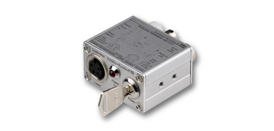 The switchbox is the interface between power supply and laser diode beam source. The integrated key switch and interlock mechanism ensure concordance with laser safety regulations IEC 825/ EN60825-1. In addition, the inputs for analog and TTL modulation are made available via simple BNC connectors, so that the time-consuming wiring of a special adapter cable is avoided.Without the switchbox Schäfter+Kirchhoff laser diode beam sources are off if either one or both modulation inputs are open. Internal pull-up resistors in the switchbox however ensure that the beam source is instantly ready for use without having to apply 5 V(DC) to the input ports just to turn it on. Once modulation is applied using the BNC connectors, the voltage of the modulation dictates if the laser is on or off.