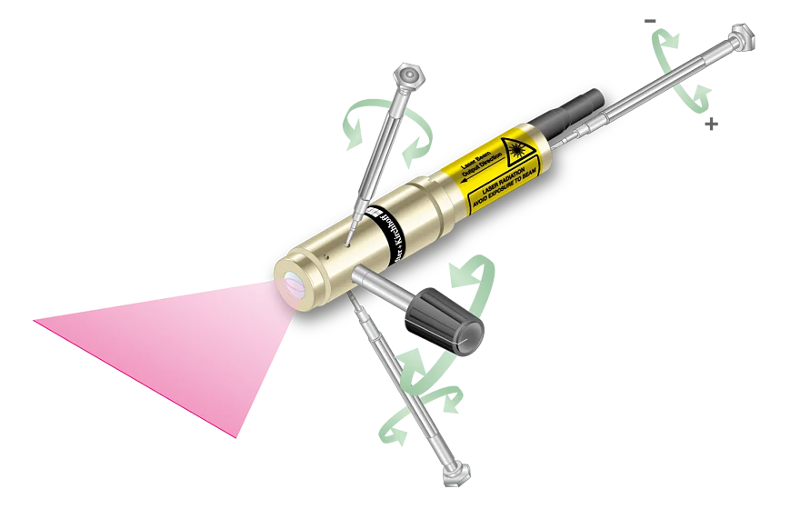 Please note, that reducing the laser power by potentiometer or analog modulation input so that it operates close to the laser threshhold negatively affects laser features like pointing stability, line width/spot size or state of polarization.