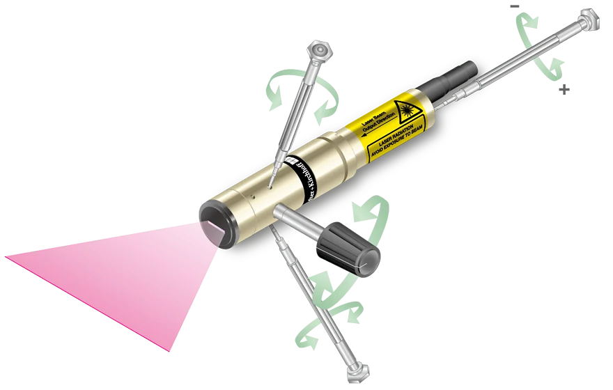 Please note, that reducing the laser power by potentiometer or analog modulation input so that it operates close to the laser threshhold negatively affects laser features like pointing stability, line width/spot size or state of polarization.