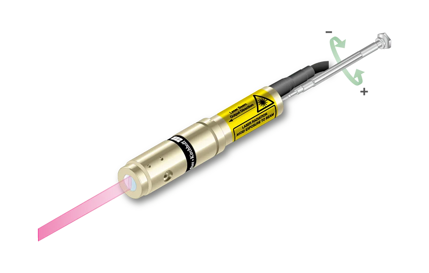 Please note, that reducing the laser power by potentiometer or analog modulation input so that it operates close to the laser threshhold negatively affects laser features like pointing stability, line width/spot size or state of polarization.