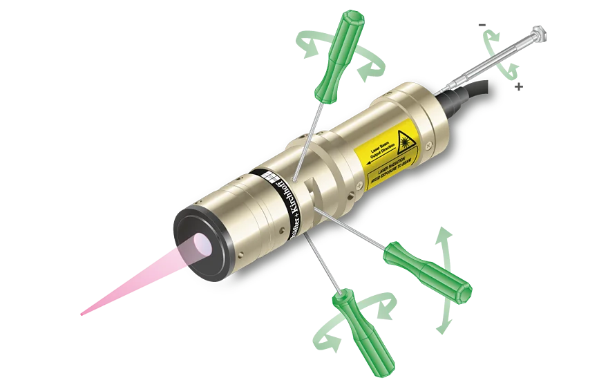 Please note, that reducing the laser power by potentiometer or analog modulation input so that it operates close to the laser threshhold negatively affects laser features like pointing stability, line width/spot size or state of polarization.