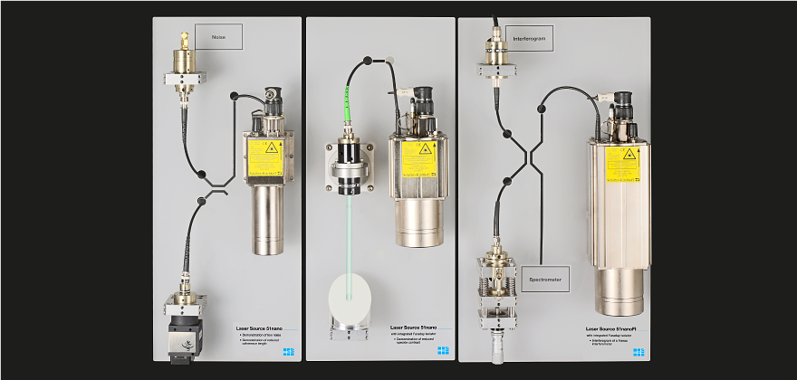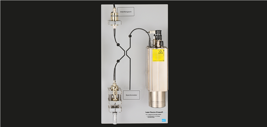 A 51nanoFI beam source that can be switched between two different states, non-stabilized (without RF-modulation) or stabilized (with RF-modulation), is used as a fiber-coupled laser source. The radiation is split using a 50/50 fiber-optical beam splitter. One portion is directed to a spectrometer to analyze the spectral power density of the source. The other part is used for the Fizeau interferometer.
