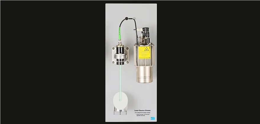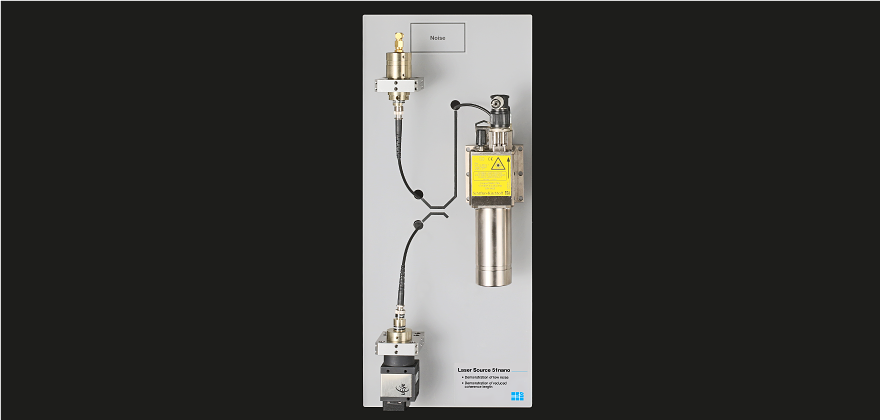 A 51nanoFI beam source that can be switched between two different states, non-stabilized (without RF-modulation) or stabilized (with RF-modulation), is used as a fiber-coupled laser source. The radiation is split using a 50/50 fiber-optical beam splitter.
