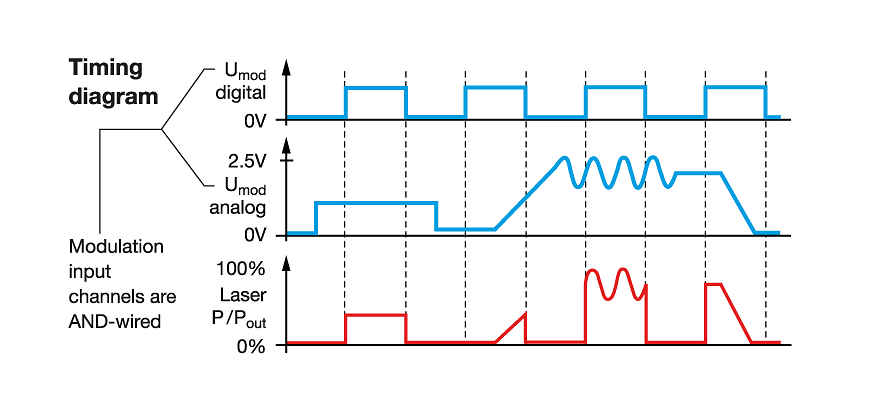 The laser has two AND-wired modulation input channels, Uanalog and UTTL.