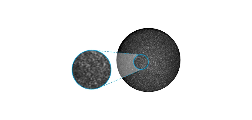 Low speckle contrast due to reduced coherence length in a large laser spot. Note that speckle contrast and size generally depend on factors such as spot size and the aperture of the optics.