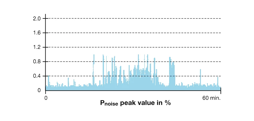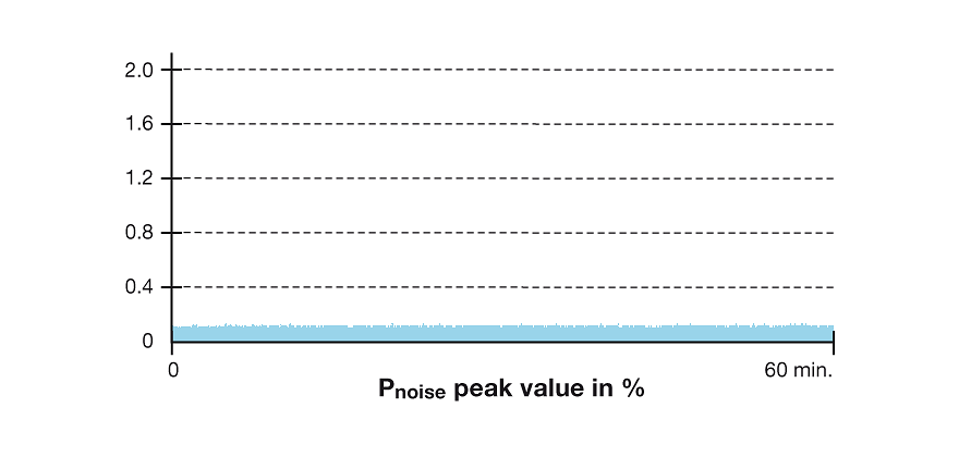 The noise profiles (bandwidth of 1MHz, period of 60 minutes) of a conventional single-mode laser and a LNC laser are compared. Peak noise values exceed 1 % for a standard laser diode while the RF-modulation of the low noise laser diode module reduces noise to typ. < 0.15 % of Po (RMS), Po is the maximum specified output power.
