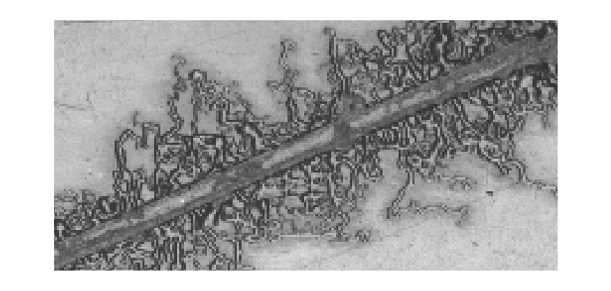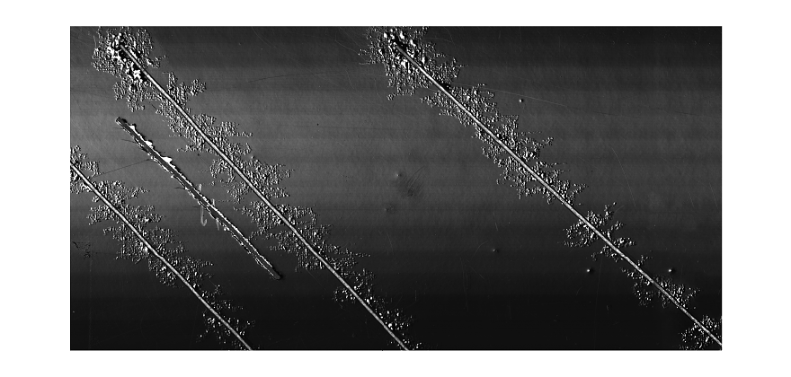 High contrast image. Flat, usually coated areas of the test plate appear light in the image. The textured and structured edges of the filiform underfilm corrosion and damaged coated areas produce darker areas in the image.