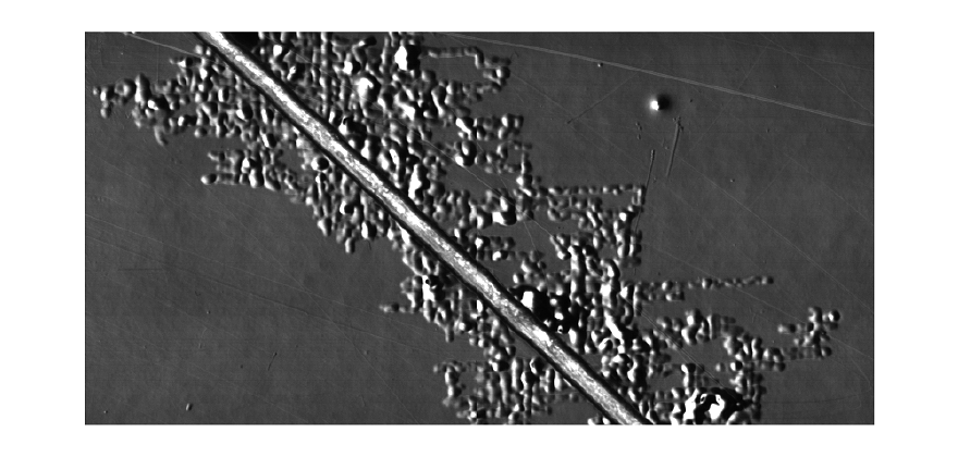 The light from the flat parts of the sample is reflected away from the camera and no longer reaches the camera aperture directly. Only stray light from reflection on edges and damaged, structured areas is detected. For extensive underfilm corrosion with flatly rising edges this setup is most beneficial. The structures appear embossed and like a relief.