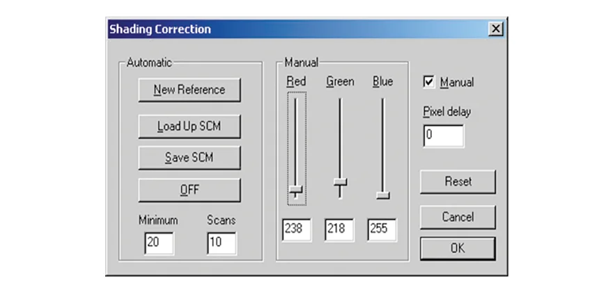 Pop-up window for performing shading correction in the SkLineScan software allows white balance calibration to be performed automatically or manually.