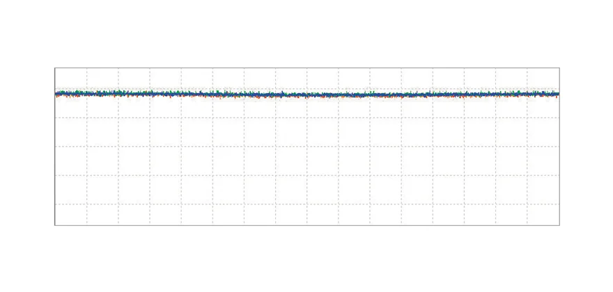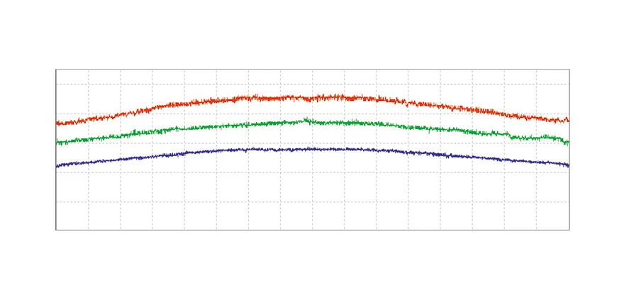 Signal from a color line scan camera of a homogeneous white calibration target. Differences in the offsets in the amplifier for the red, green and blue signals lead to a differing signal level for the three colors.